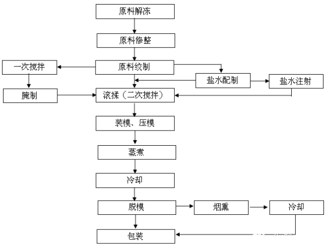 火腿類(三明治、午餐火腿等)工藝流程: